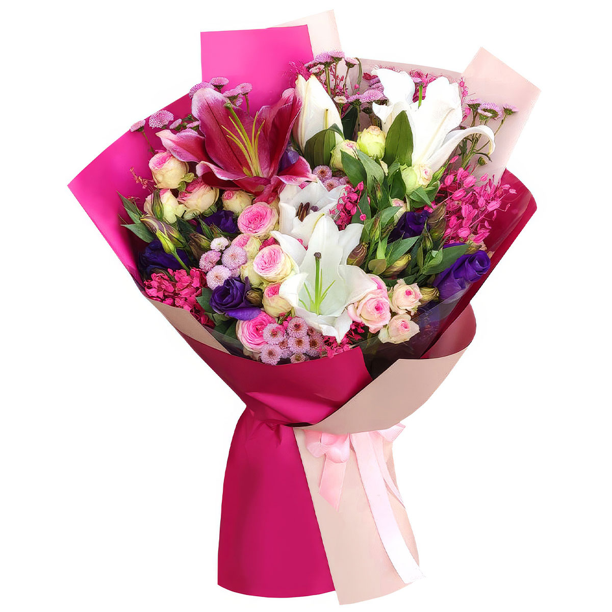 Лилия белая и розовая, роза кустовая пионовидная розовая, маргаритка розовая мини, эустома фиолетовая, лунария розовая. Упаковка (лента, пленка, крафт, сетка, пленка матовая)
