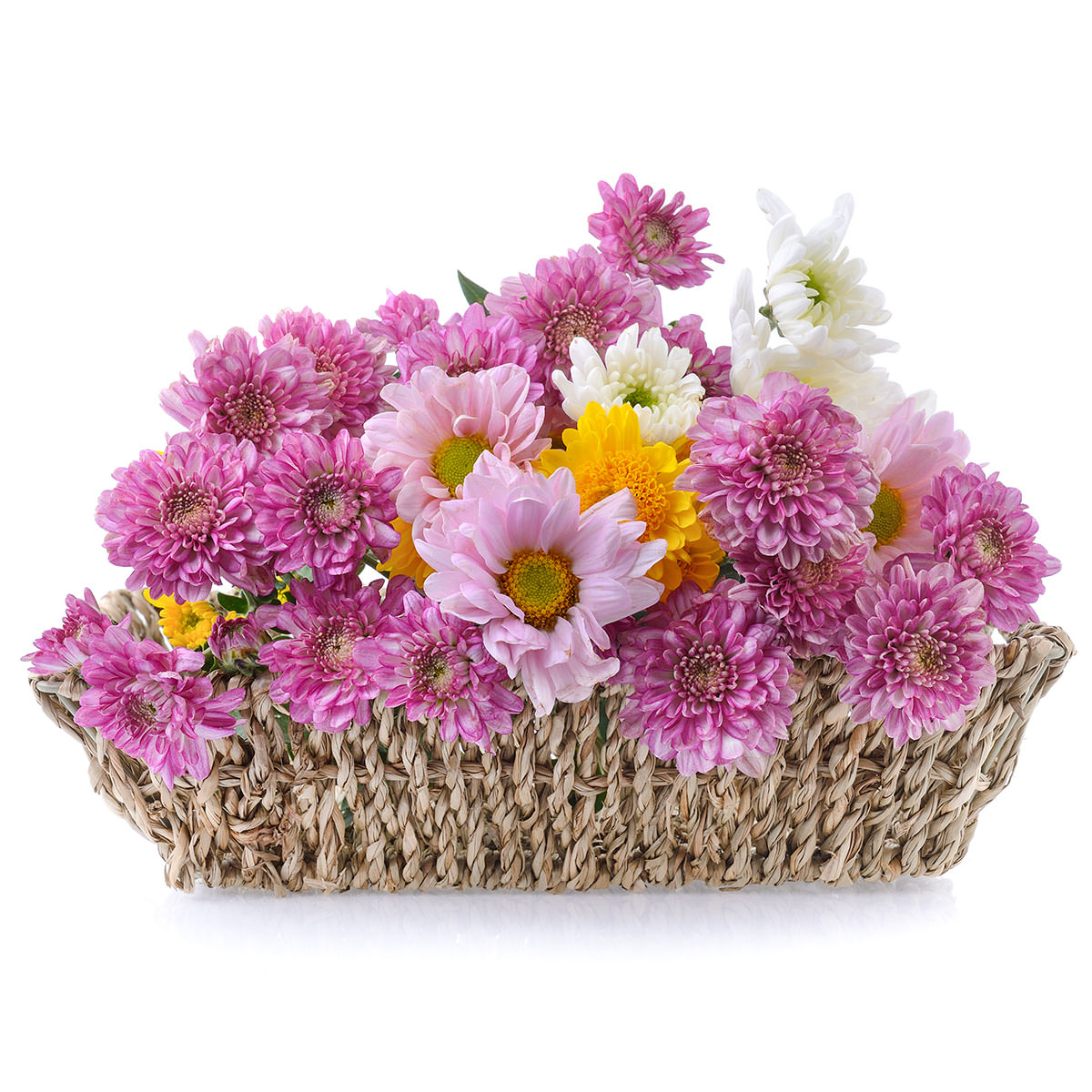 Хризантема розовая, сиреневая, белая и желтая. Упаковка (Корзина, оазис, ящик).