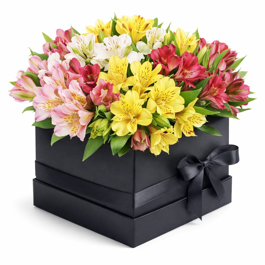 Альстромерия микс (желтая, розовая, красная). Упаковка (шляпная коробка, квадратный бокс, коробка сердце, оазис)
