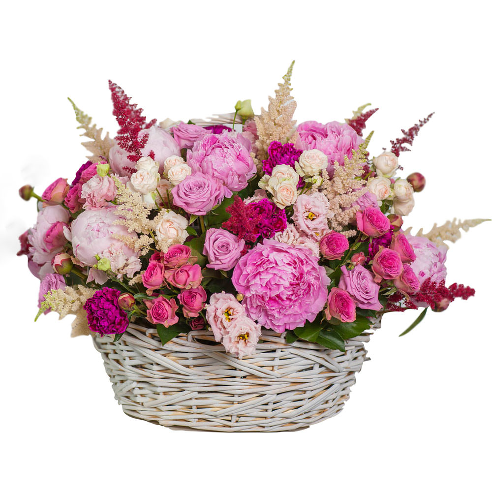 Роза кустовая микс (кремовая, розовая), пион розовый, астильба, эустома розовая. Упаковка (Корзина, оазис).