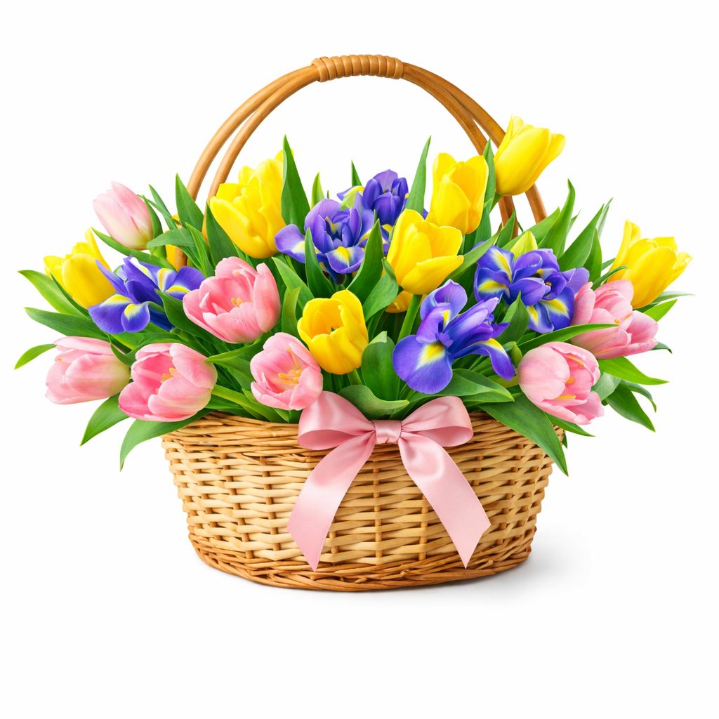 Тюльпаны микс (желтый, розовый), ирис. Упаковка (Корзина, оазис).
